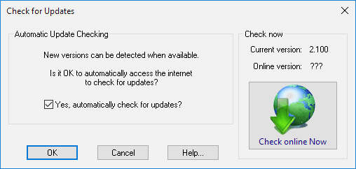 Use the Help->Check for updates... menu option at any time for check for the latest version of the software. The following window is shown: